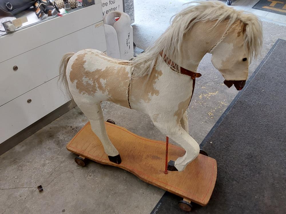 CHEVAL A BASCULE ANCIEN SUR ROULETTES A RESTAURER