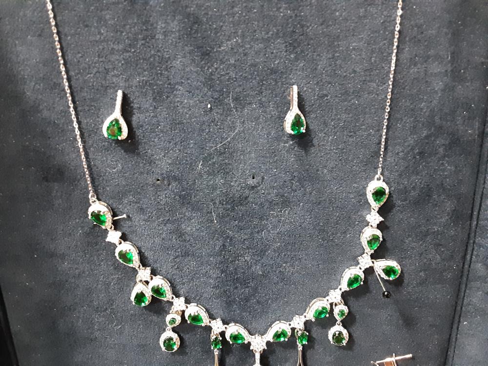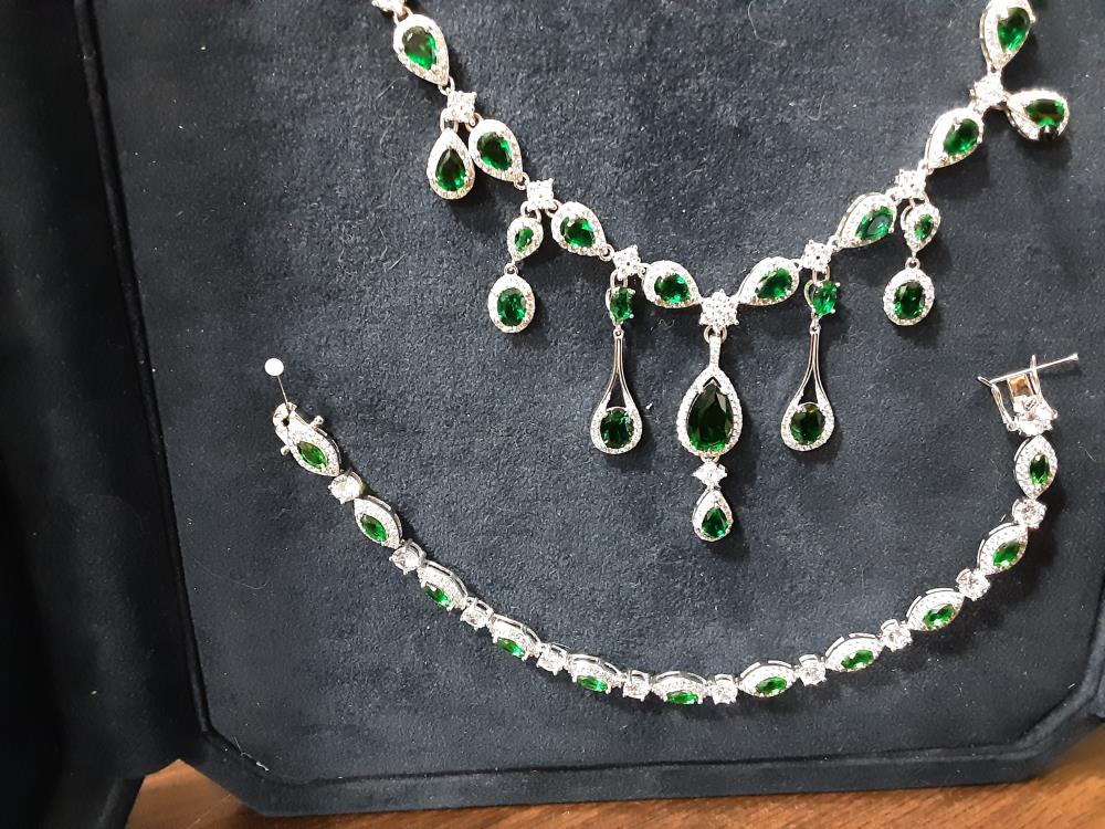 PARURE COLLIER + BOUCLES + BRACELET EN ARGENT PIERRES VERTES