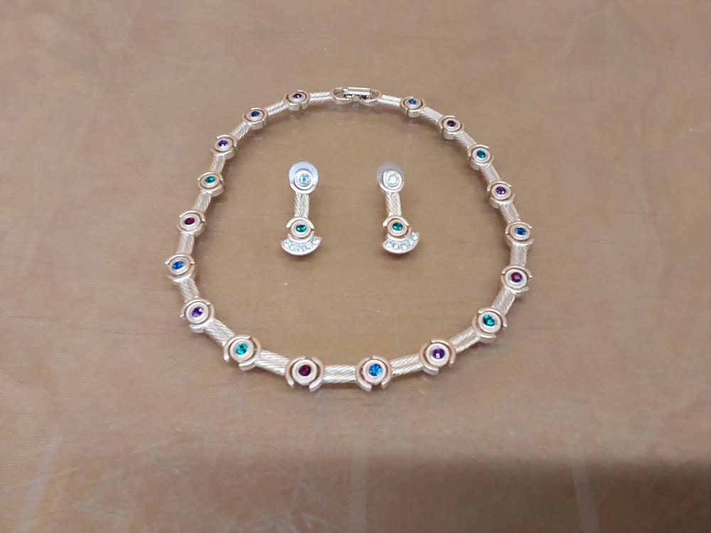 PARURE COLLIER + BOUCLES D'OREILLES DORÉE ET PIERRES COLORÉES