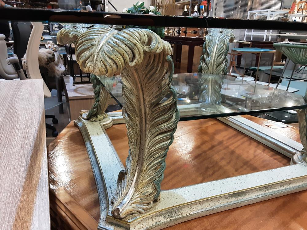 TABLE BASSE CARRÉE PIEDS FEUILLES ET PLATEAUX VERRES