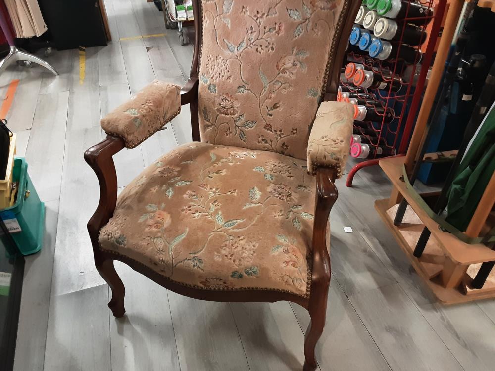 FAUTEUIL VOLTAIRE A CREMAILLERE TISSU BEIGE ET FLEURS