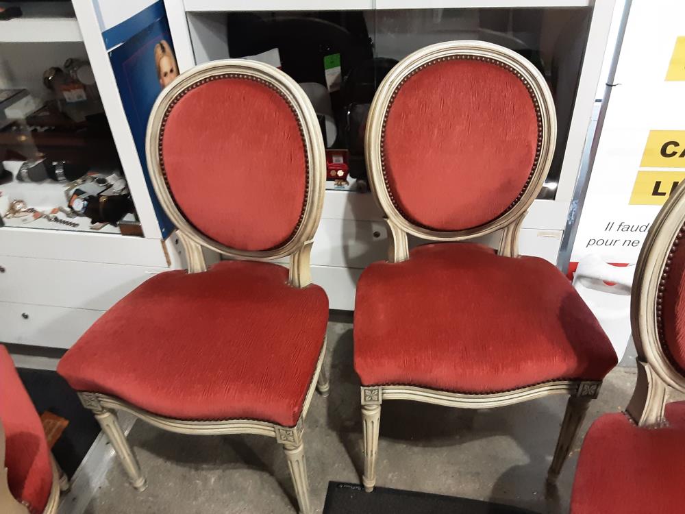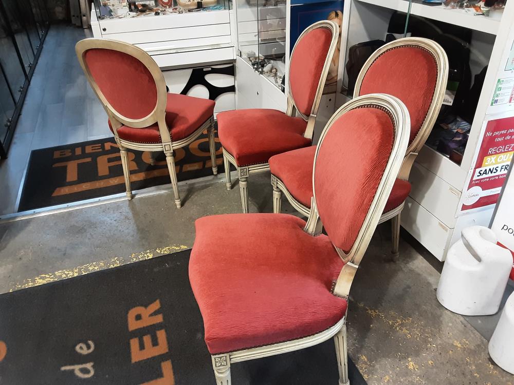 LOT DE 4 CHAISES MEDAILLONS STYLE LOUIS XVI TISSU ROUGE CADRE BLANC CASSÉ