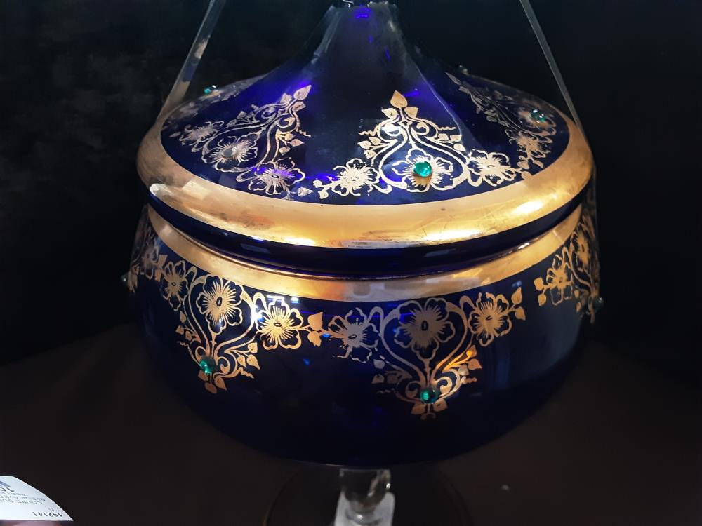 COUPE SUR PIED GM BLEUE AVEC DORURE ET PERLES VERTES