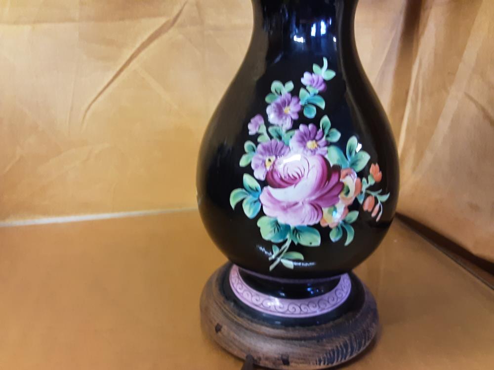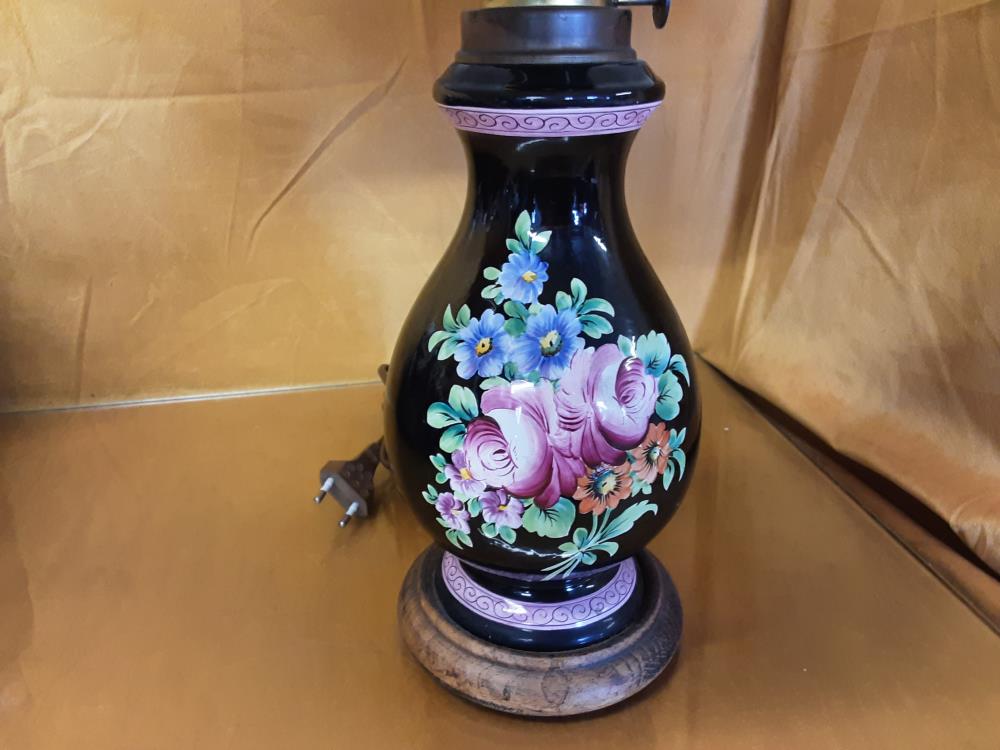 LAMPE PIED NOIR PORCELAINE MOTIF FLEURS ABAT JOUR TISSU BEIGE