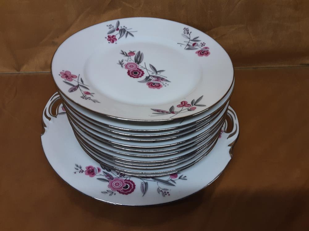 LOT DE 12 ASSIETTES DESSERTS + PLAT PORCELAINE DE LIMOGES MOTIF FLEURS ROSES BORDURE ARGENTEE
