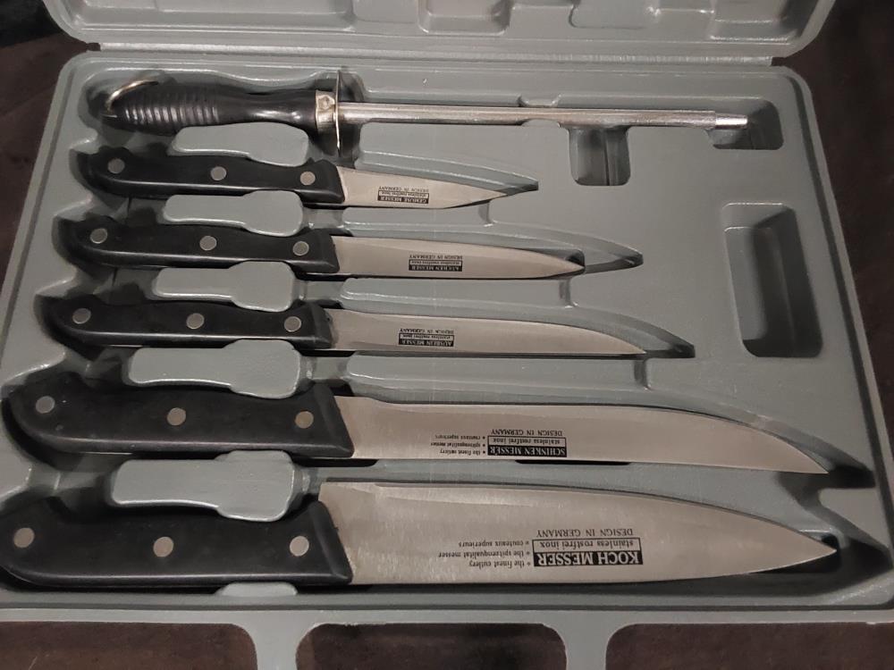 LOT DE 5 COUTEAUX + EGUISEUR + PLANCHE PM DANS MALETTE GRISE