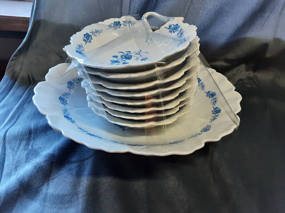 SERVICE A DESSERTS 8 COUPELLES + 1 PLAT LIMOGES FLEURS BLEUES