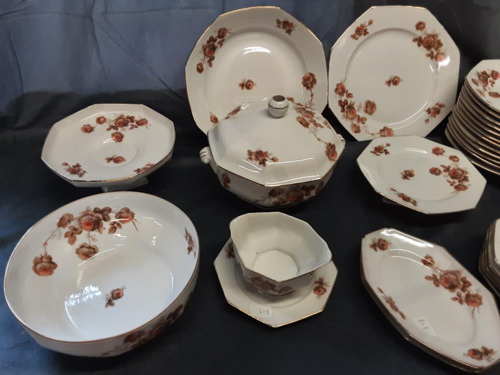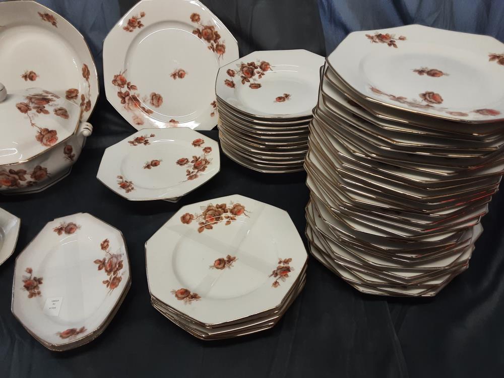32 assiettes plates - 12 creuses - 2 raviers - 1 saucière - 2 plateaux a gateaux sur pied - 1 saladier - 2 plats - 1 soupière