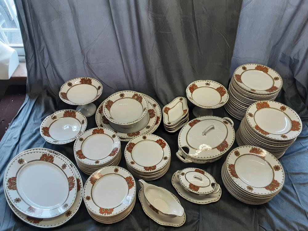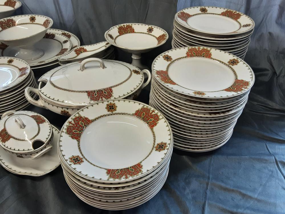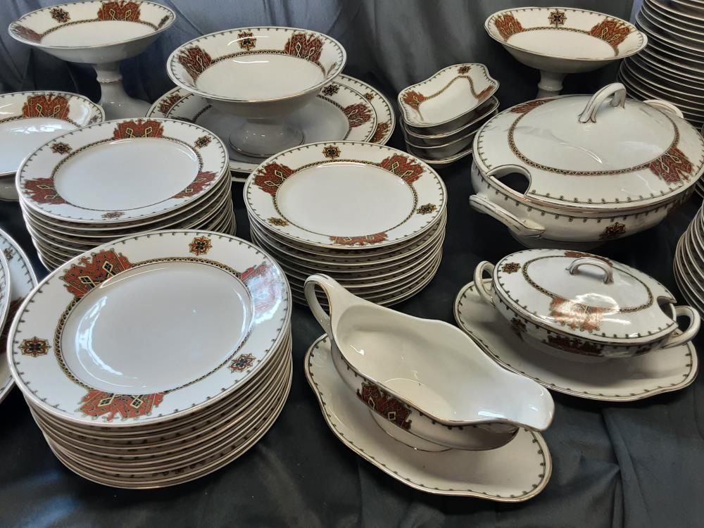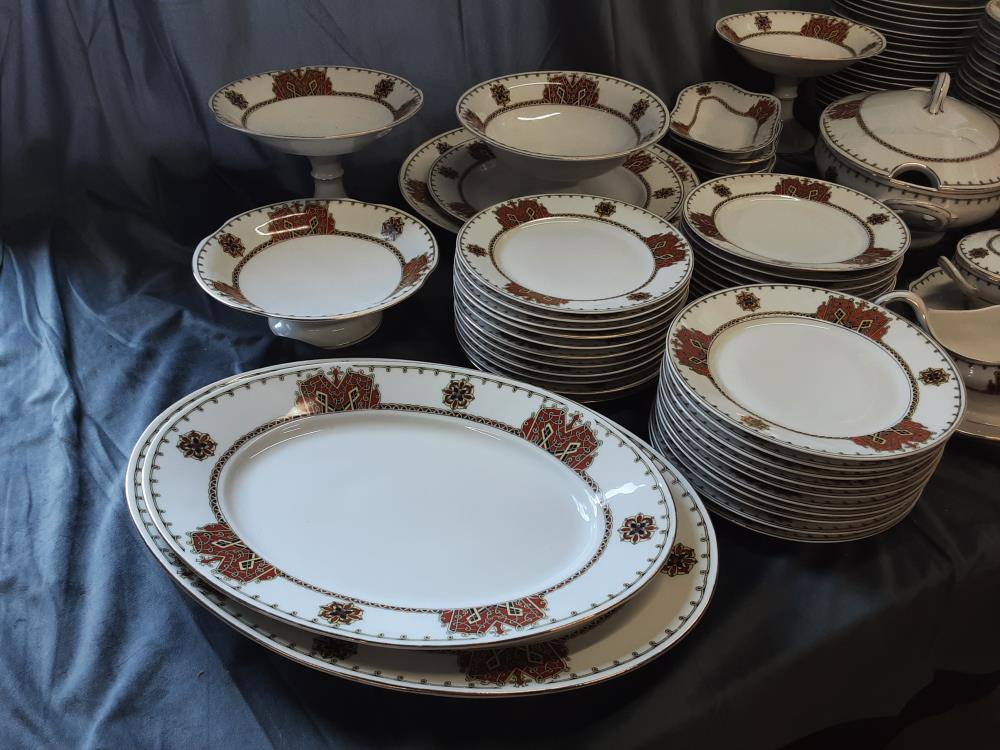 44 assiettes plates11 assiettes creuses31 assiettes a desserts4 raviers2 saucieres2 plats ovales2 plats ronds4 plats sur pieds differentes tailles1 légumier