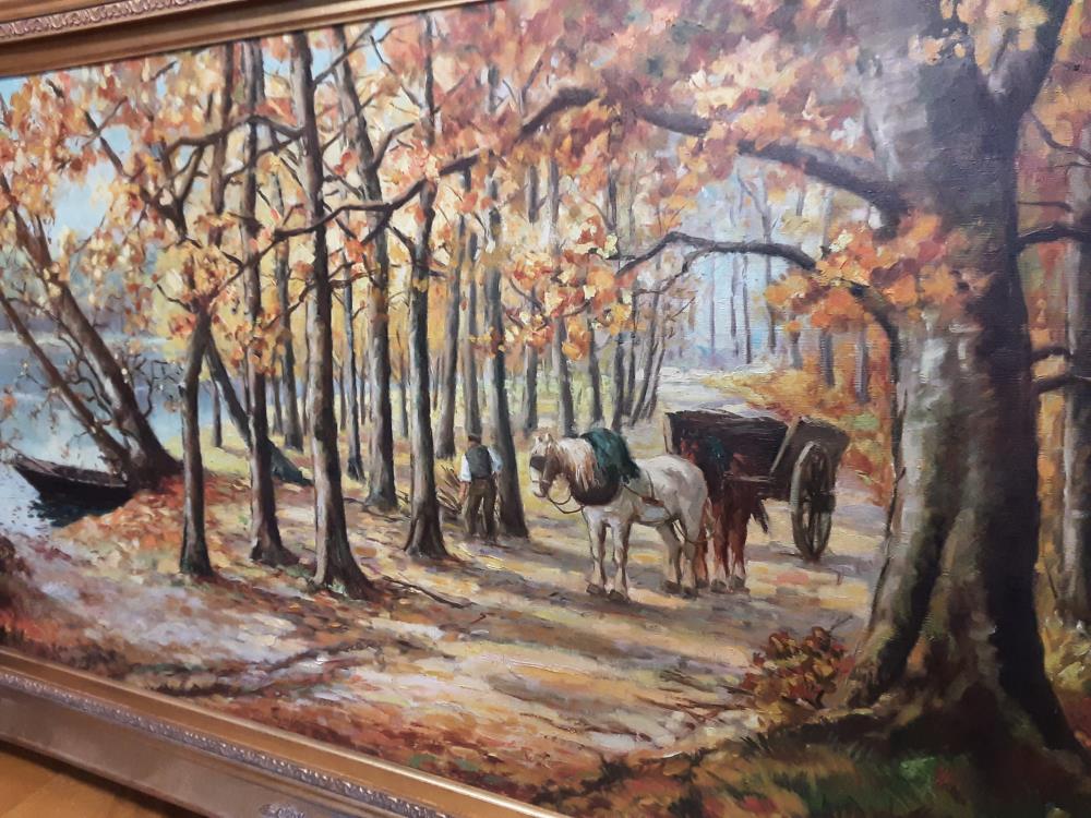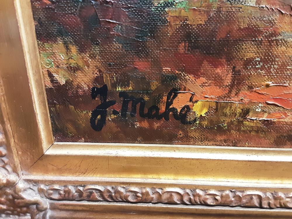 TABLEAU FORET ET LAC PAYSAN AVEC CHEVAUX SIGNÉ J.MAHÉ