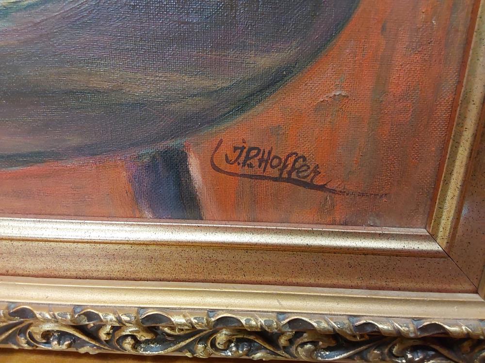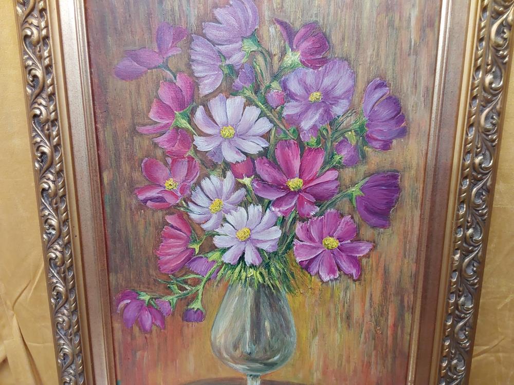 TABLEAU POT DE FLEURS ROSES ET VIOLETTES SUR TABLE SIGNÉ J.P HOFFER