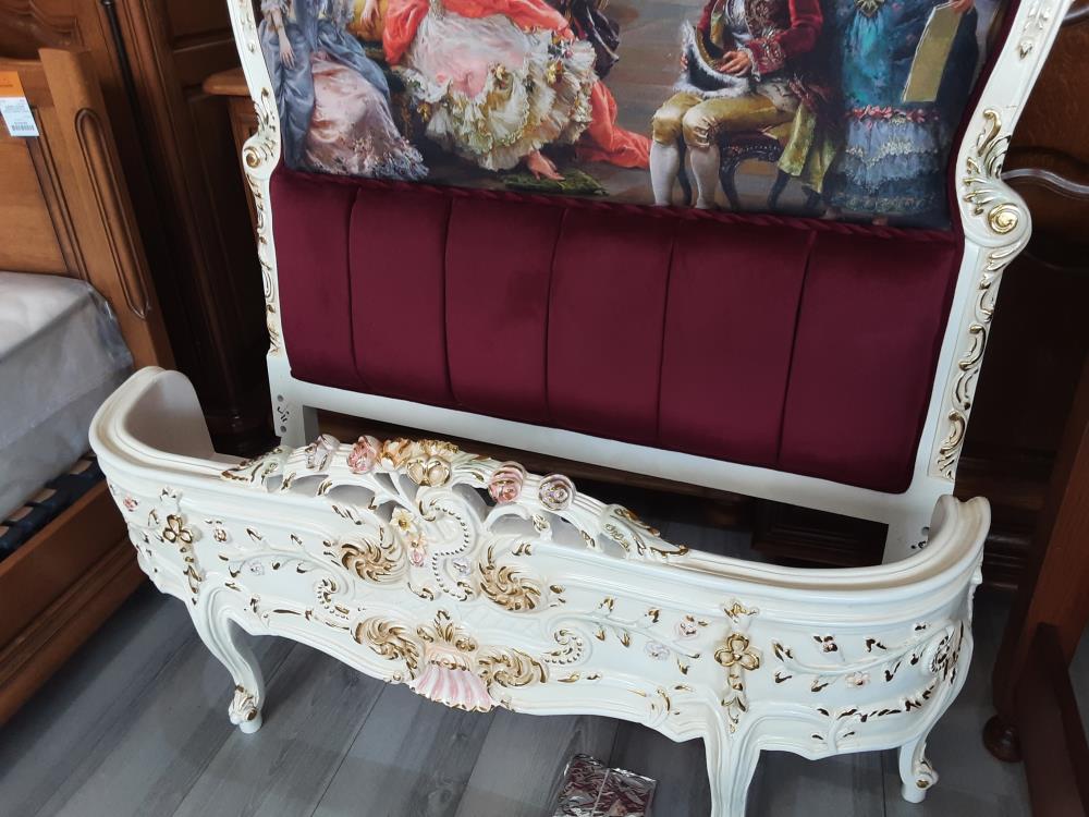 LIT BAROQUE 1 PERS. 110 X 190 TISSU ROUGE MOTIF MARQUISE CADRE BLANC ET COULEURS