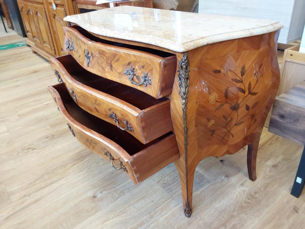 COMMODE 3 TIROIRS LOUIS XVI MARQUETEE PLATEAU MARBRE BEIGE