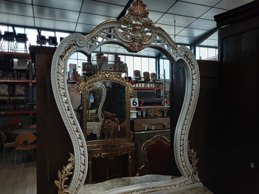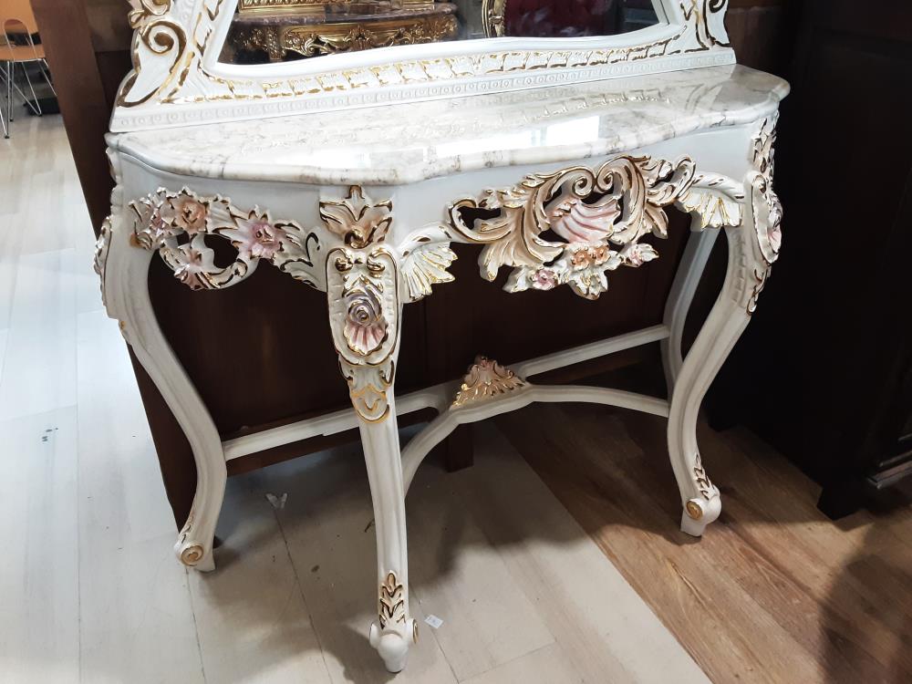 CONSOLE AVEC MIROIR BAROQUE CADRE BLANC ET DORE MARBRE BLANC BEIGE