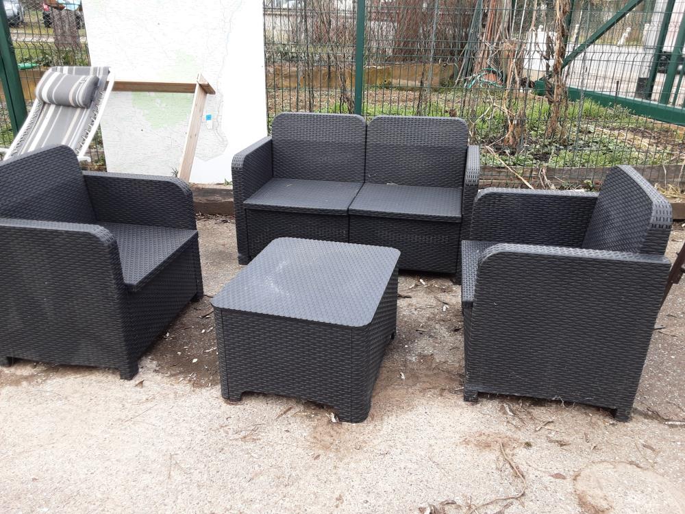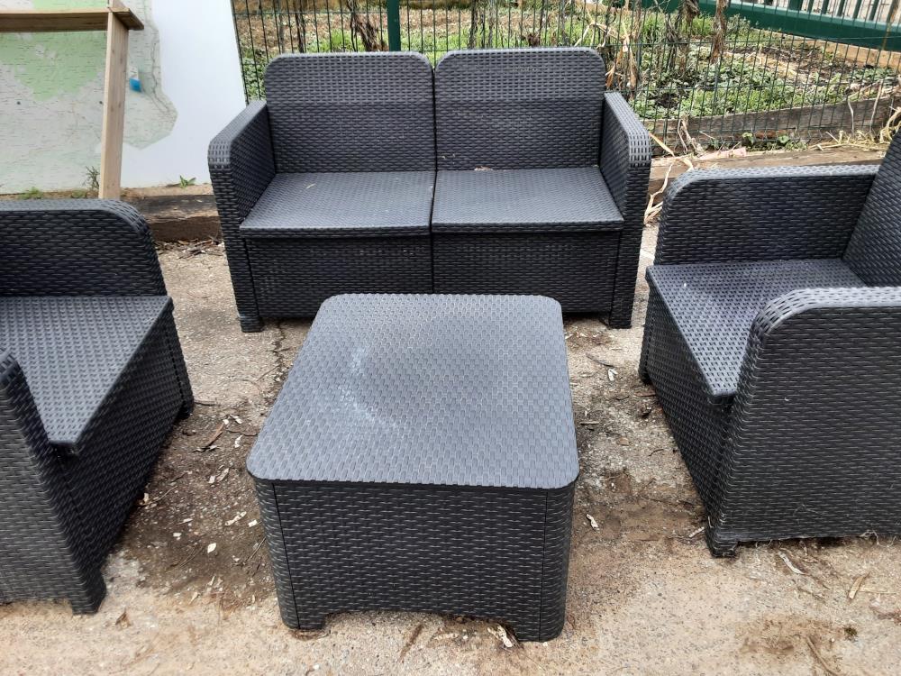 SALON DE JARDIN CANAPE, 2 FAUTEUILS ET UNE TABLE BASSE EN PVC